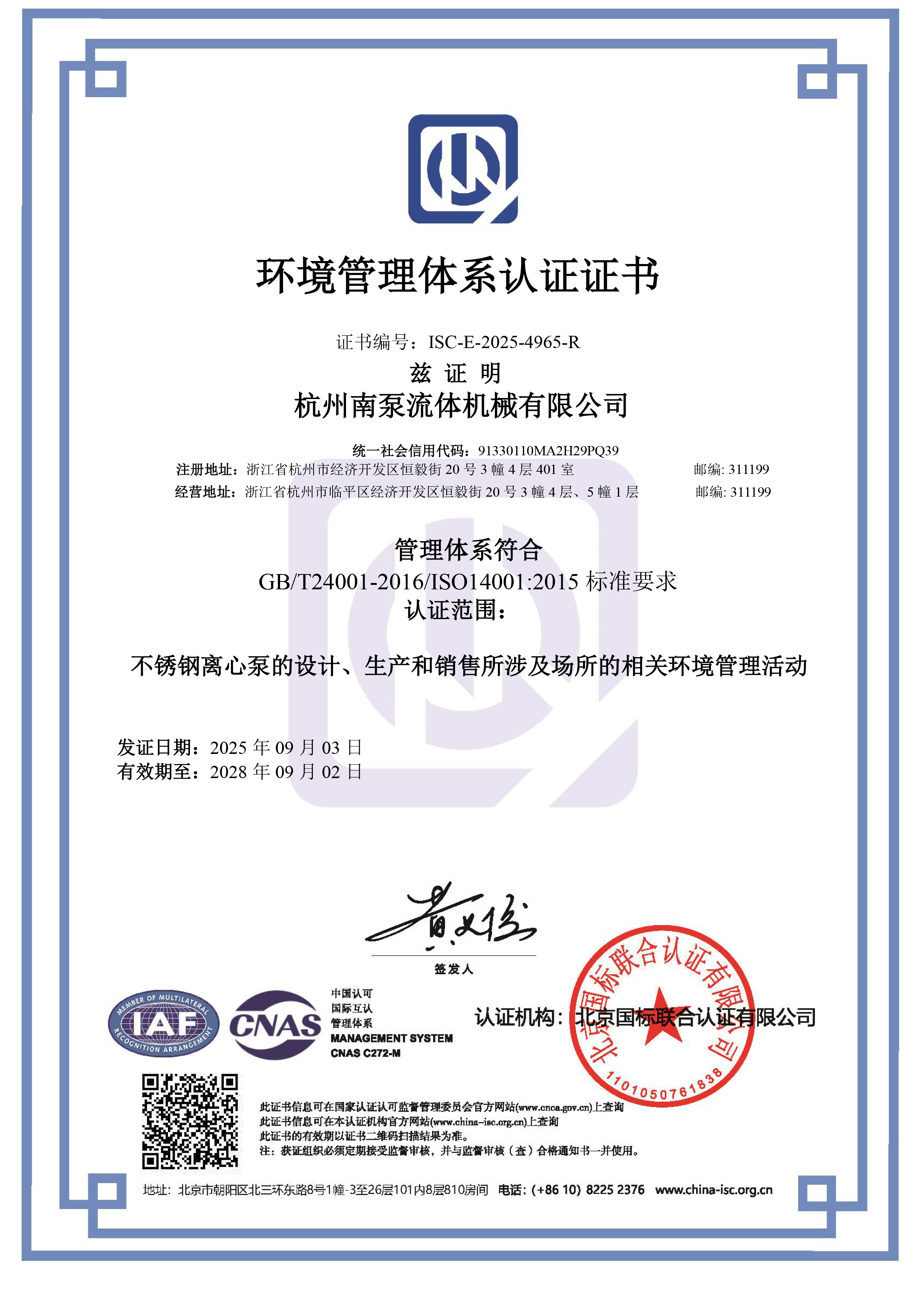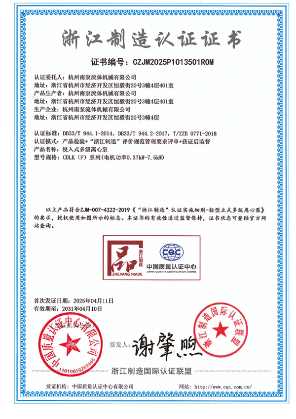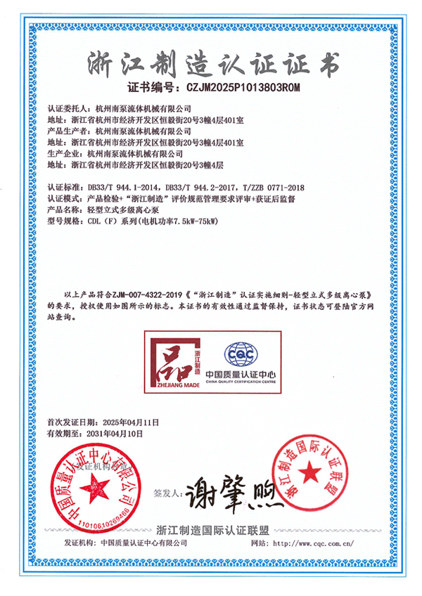 浙江制造認(rèn)證證書(shū)-CDL(F)系列(電機(jī)功率0.37kW-7.5kW)